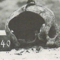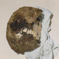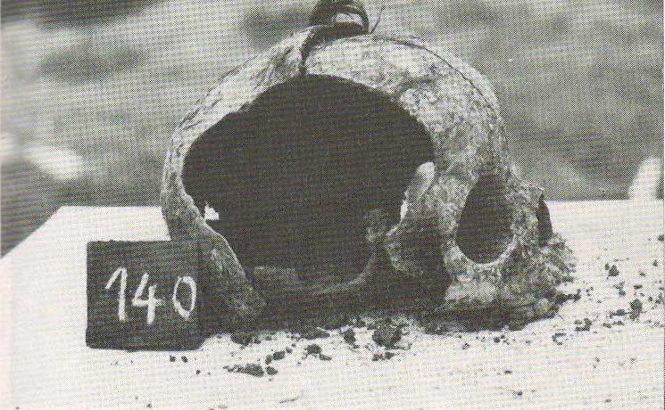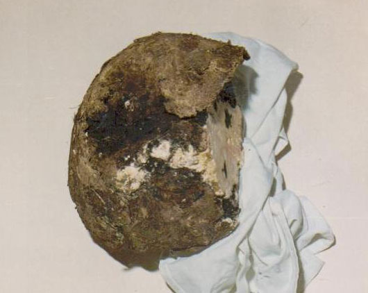 Among the skulls, there was one skull that was fully preserved, and as a result of a special postmortem process (Saponification), the brain was fully preserved. On the crown part of the occipital bone an irregular defect was discovered.