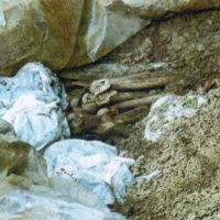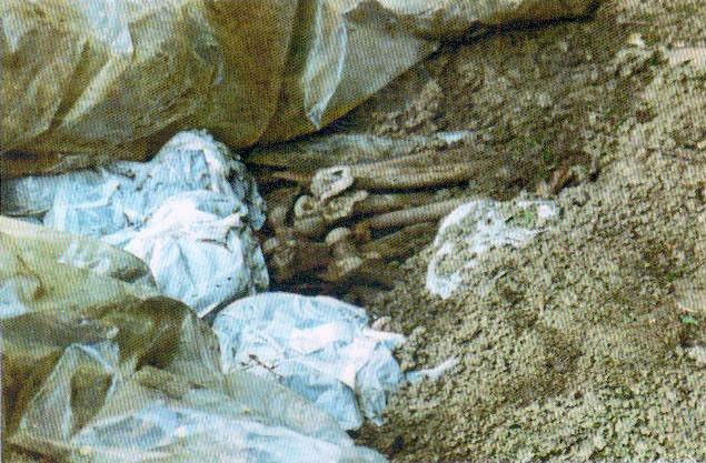 Removal of shrubs and weeds started in April of 1993. A depression showed up. Based on the compactness of the soil, the composition of this depression and the surrounding land, it was established that there had been no previous excavation. The grave was drilled with a hand probe. Already at a 60 cm depth, the probe scraped and bounced, an early sign that the first borehole was positive. They began opening the grave. It was opened to its full-width and to a length of 1.5 m. At this depth, a piece of nylon foil was found.